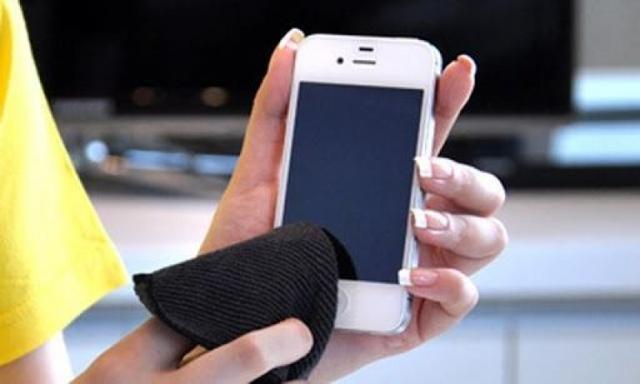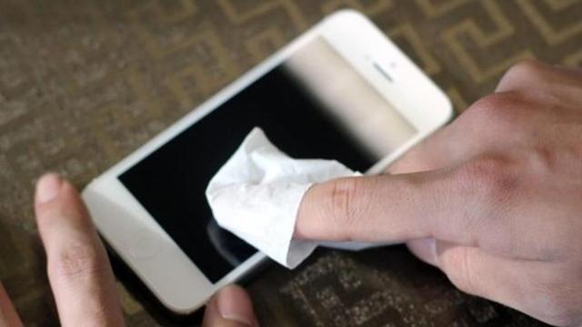 如果手邊沒有專用清潔液,也可用「精密擦拭布」或「濕紙巾」來擦拭表面,或將水噴灑在布上擦拭,切勿直接將水噴在手機上,這個方法同樣適用在手機背面。