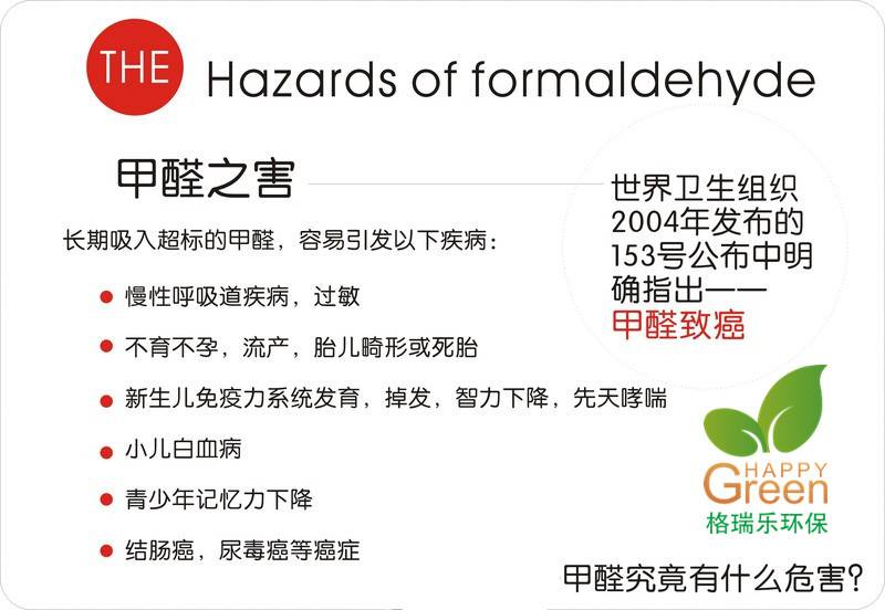 綠健君安提醒您:甲醛為較高毒性物質,甲醛中毒對人體健康的影響主要表現在嗅覺異常、刺激、過敏、肺功能異常、肺功能異常和免疫功能異常等方面,具有強烈的促癌和致癌作用。已經被世界衛生組織確定為致癌和致畸性物質,是公認的變態反應源,也是潛在的強致突變物之一。